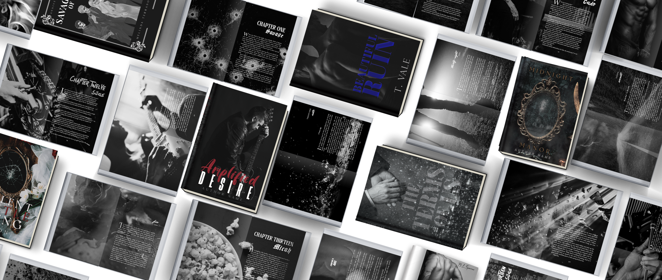 This portfolio brings together interior and cover design work across custom and premade projects